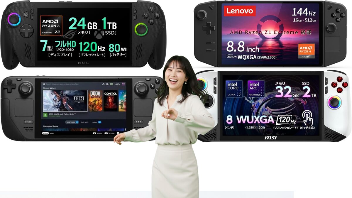 | 性能/画質重視 | ROG Xbox Ally X | Z2 Extreme (Zen 5/RDNA 3.5)と24GBメモリで1080pゲームを最も快適にプレイ可能。外部GPU接続の拡張性も最高水準。 |