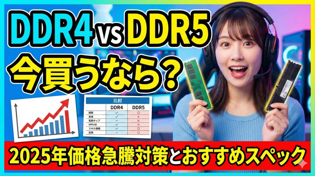本記事では、2025年11月時点での異常な価格高騰の背景を解説し、DDR4とDDR5のどちらを「今」買うべきかの判断基準、そして失敗しないための推奨スペックについて、徹底的に解説します。