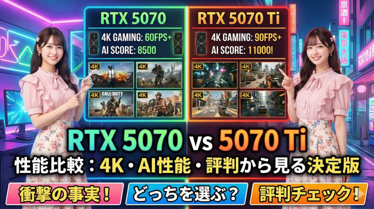重要なのは、「後悔ポイント」を避けることです。4KやAIに挑戦したいのに5070を選んでVRAM不足に悩むこと、あるいはWQHDで十分なのにオーバースペックなTiモデルに過剰投資すること。どちらも避けるべき選択です。
