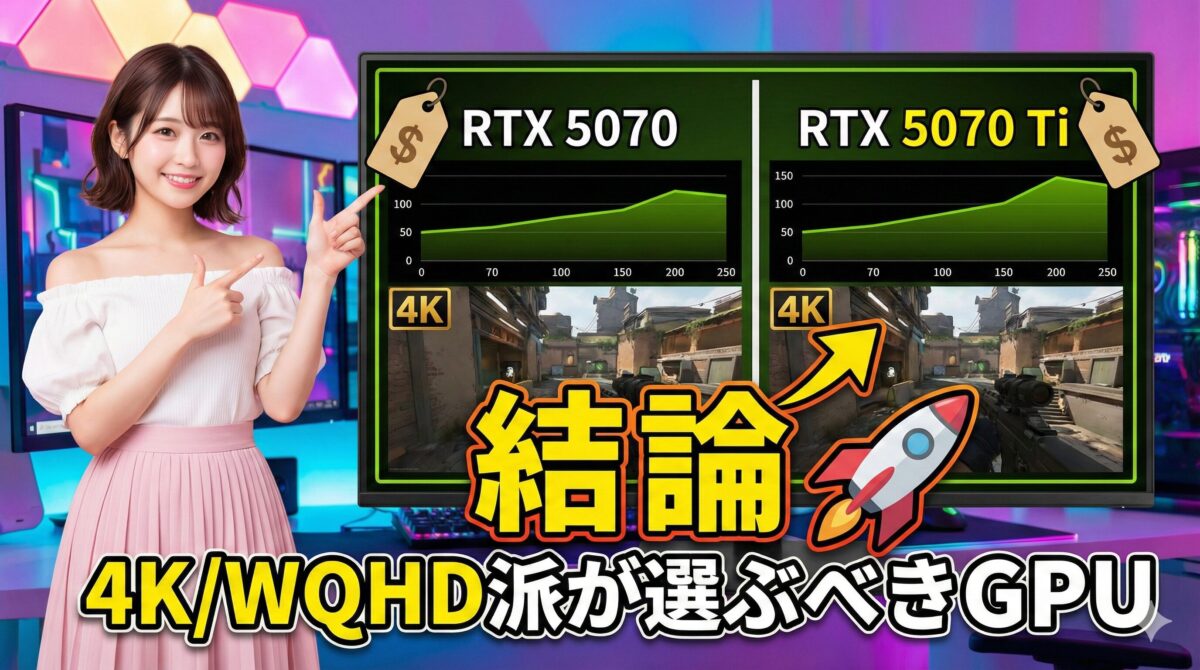 あなたが4Kモニターを持っているなら、RTX 5070 Tiを選ぶことは、妥協のない最高の体験を手に入れるための戦略的な投資と言えます。💰