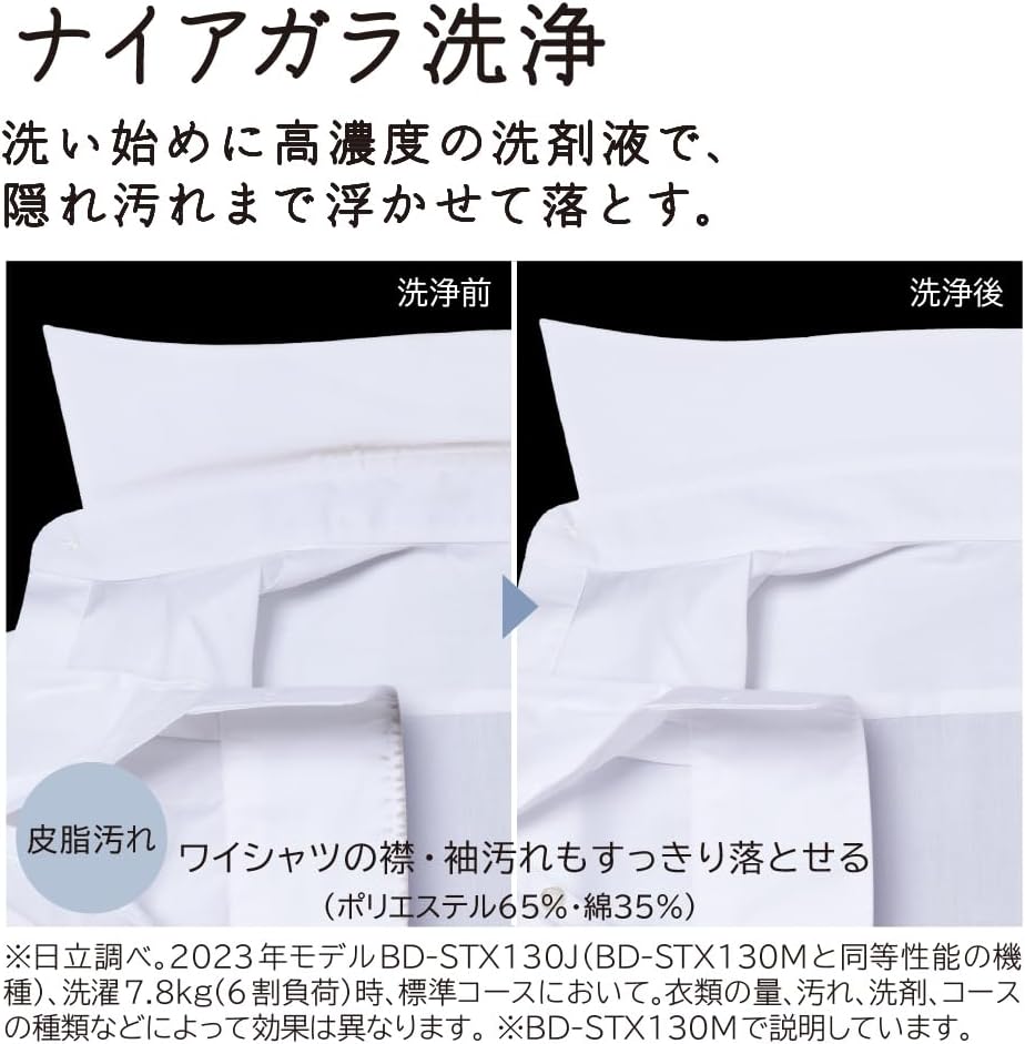 さらにBD-STX130MLは、槽内に温水ヒーターを搭載しています。この温水機能とナイアガラ洗浄を組み合わせたのが「温水ナイアガラ洗浄」です。水を温めることで、洗剤の酵素活性を最大限に高め、洗浄力を物理的・化学的な両面から強化します。