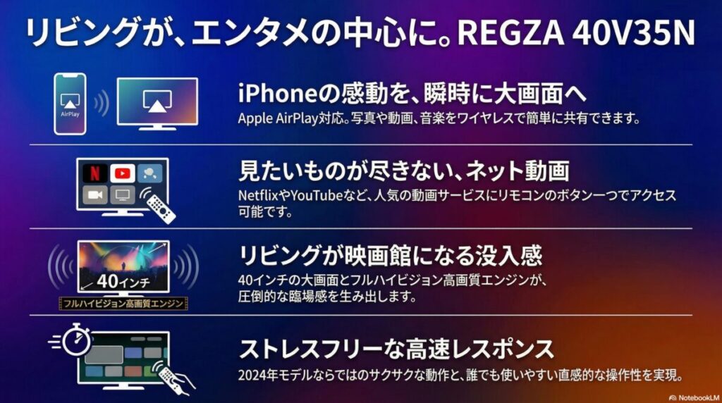 REGZA 40V35Nは、単に「テレビが見られる」というだけでなく、日々の暮らしを豊かに彩る「エンターテイメントハブ」として設計されています。その数々の機能とメリットを深掘りし、なぜ今このテレビを選ぶべきなのかを解説します。