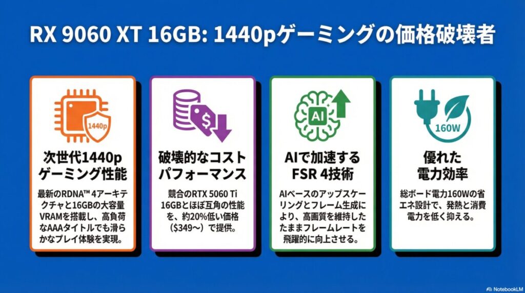 RX 9060 XT 16GBの持つ「破壊的なバリュー(価値)」は、高性能と低価格が両立したことで実現しています。これは、GPUコア性能とVRAM容量の最適なバランスを追求したRDNA 4世代の設計思想の賜物です。